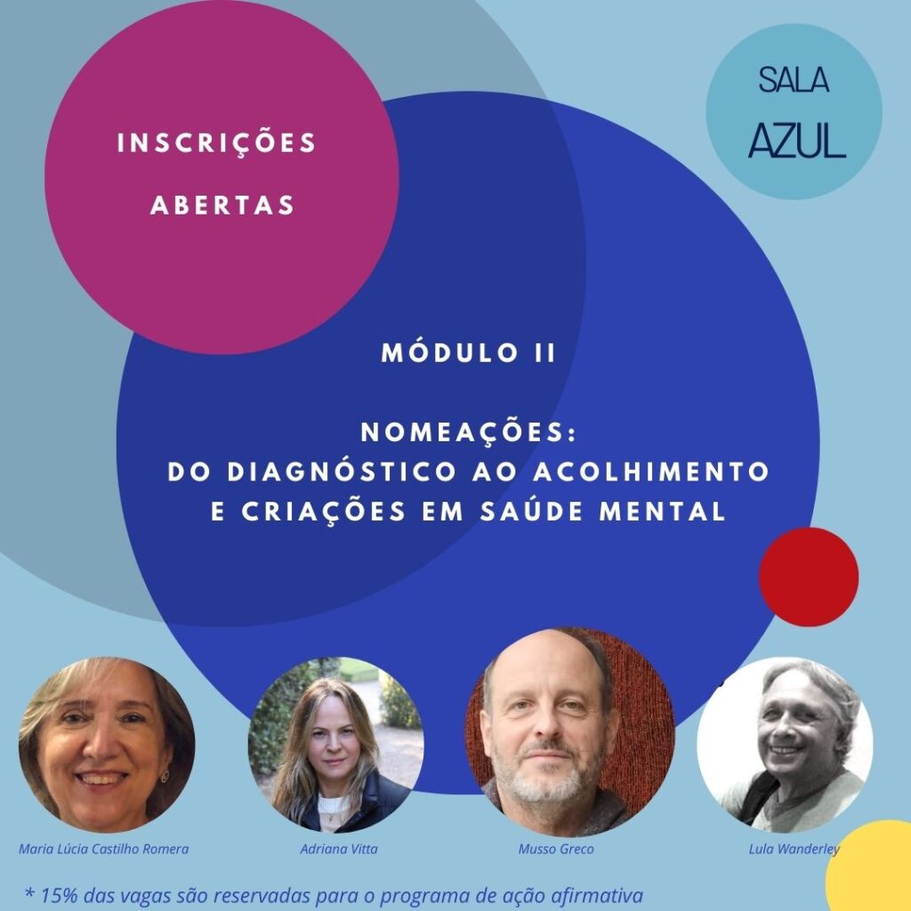 A SALA AZUL abre as inscrições para o segundo módulo da Temporada 2025, Arte e Saúde Mental. Com o propósito de ser um espaço plural, aberto a diferença, com número limitado de participantes e com encontros ministrados por profissionais de todo o país o Módulo 2 Nomeações: Do diagnóstico ao acolhimento e criações em saúde mental é composto das seguintes aulas: