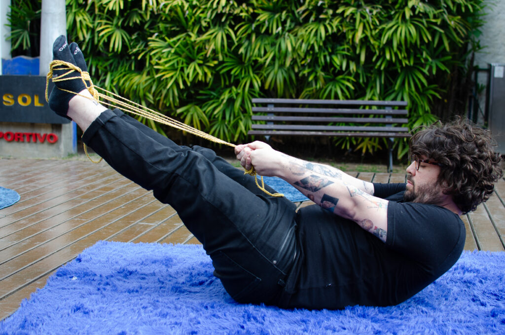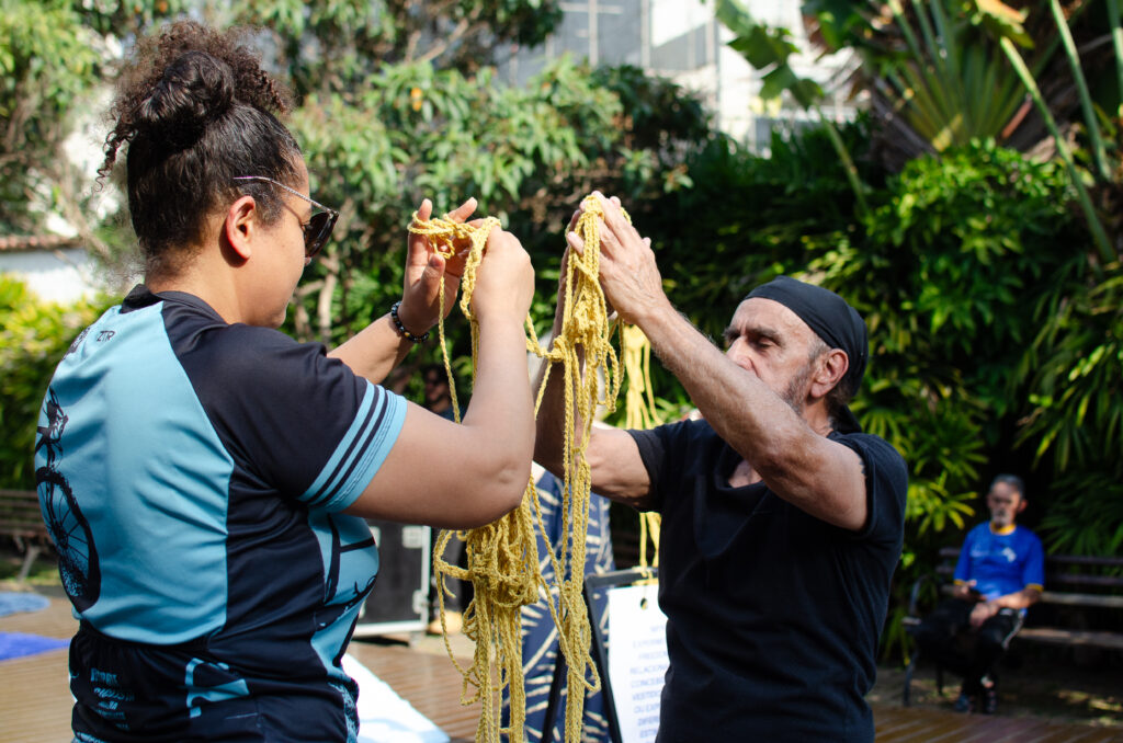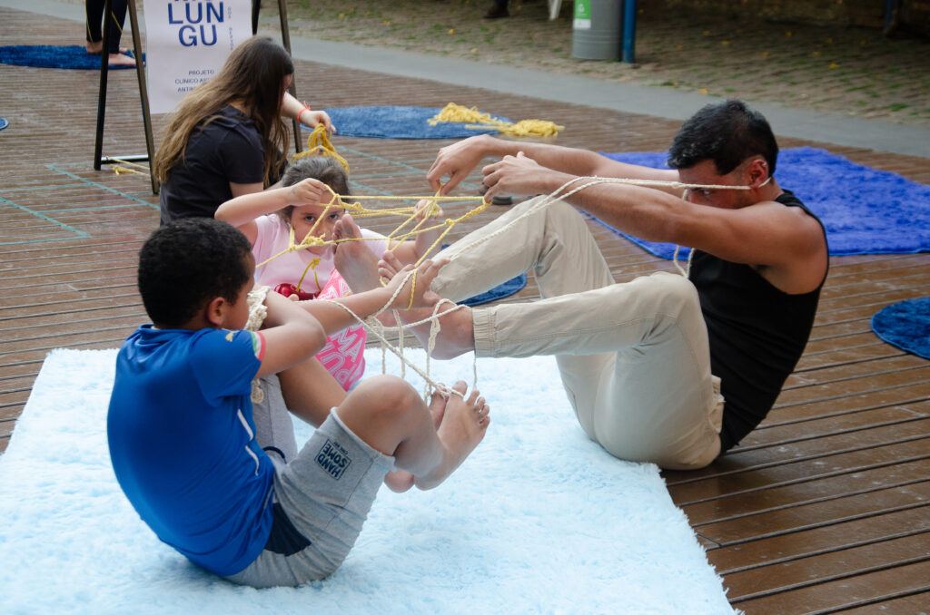 A experiência clínico-artística começa com a realização de um minicurso aberto para todas as pessoas, de todas as idades. Pela pesquisa continuada de seus idealizadores, marcamos total abertura para a participação de pessoas com deficiências e/ou com experiência com a Loucura (usuários da rede pública de saúde mental, hospital-dia, pessoas que já passaram por internação psiquiátrica ou que se auto afirmam com experiência com a Loucura), além de pessoas interessadas pela interface Arte e Saúde, seja por experiências pessoais ou profissionais. Durante os encontros criamos com esse coletivo diverso de pessoas a oficina-performance MULUNGU: CUIDE DOS NERVOS. Uma intervenção artística para o tratamento dos afetos, um espaço de cuidado através da Arte, que convida o público a se relacionar coreograficamente com os freedoms – objetos relacionais feitos de crochê.