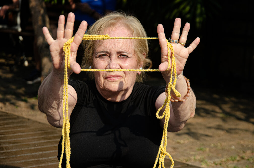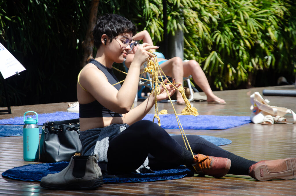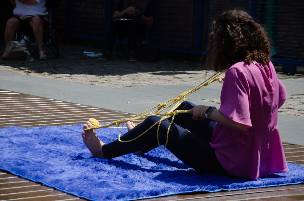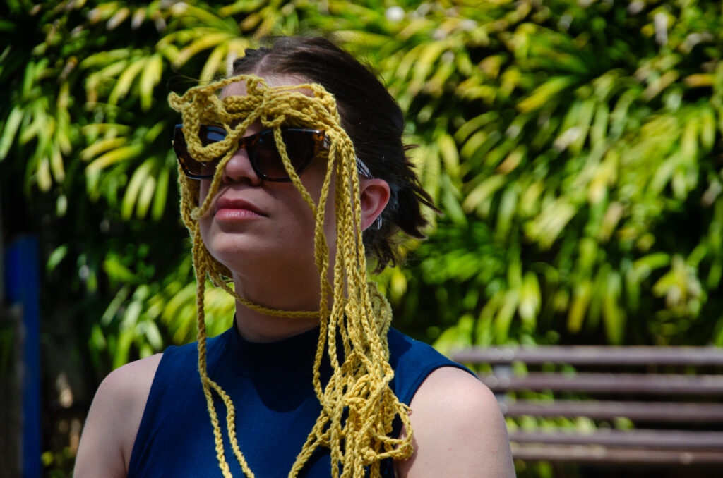 Improvisos e experimentações com freedoms – objetos relacionais de crochê – concebidos para serem vestidos, manipulados ou experienciados de diferentes formas, estimulando uma vivência sensorial e subjetiva a partir da pergunta: “Como cuidar dos nervos?”